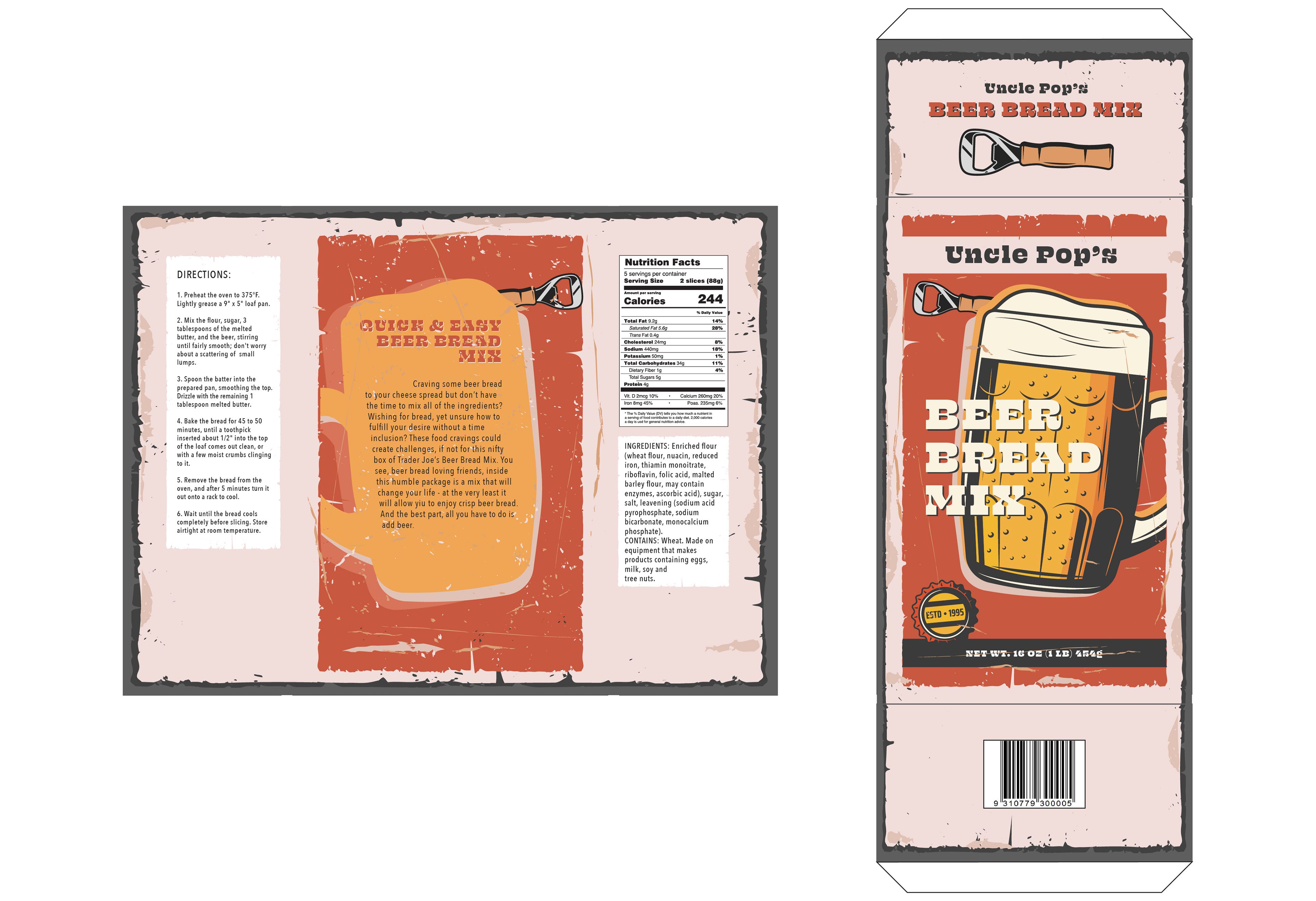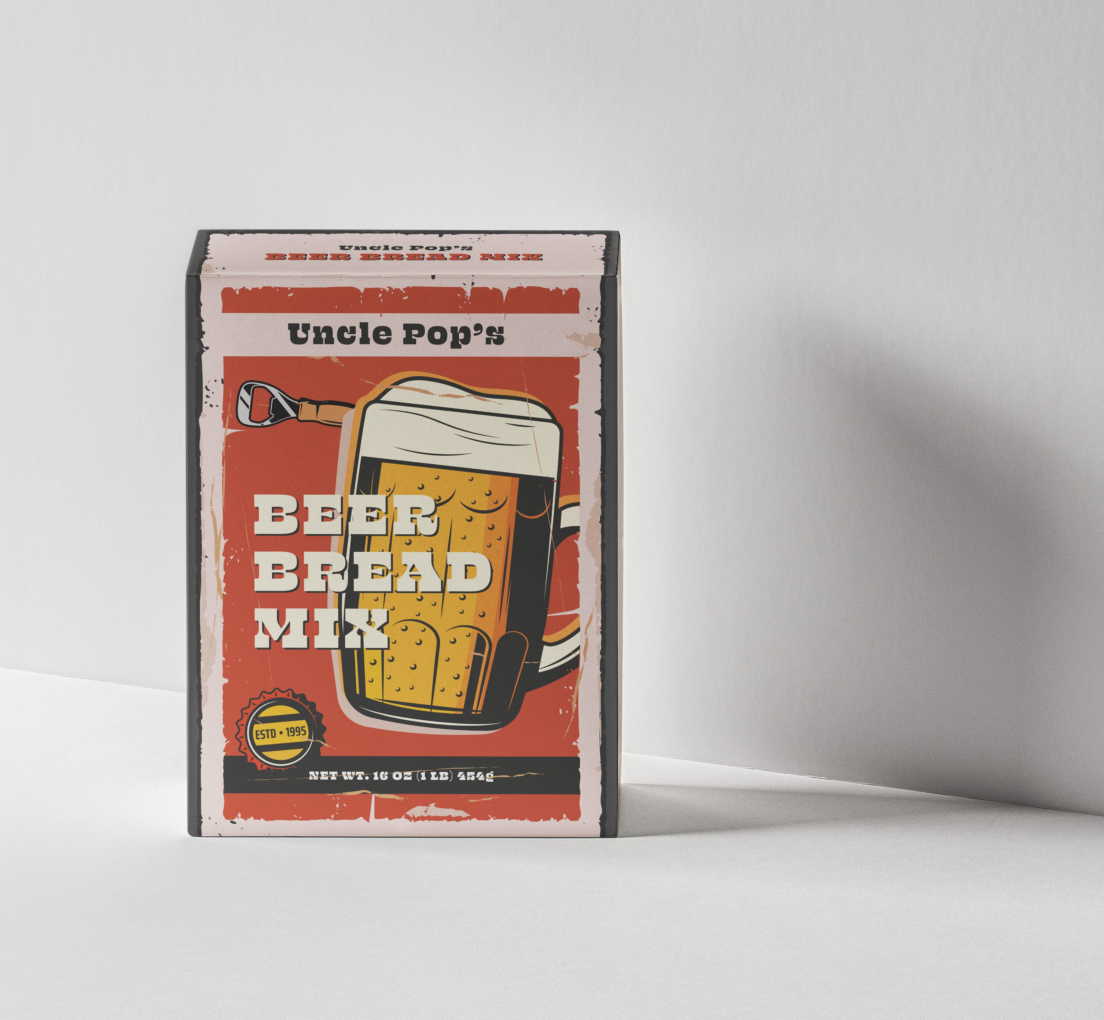 Package Design for Uncle Pop's Beer Bread Mix. This brand is emphasized through a rustic and playful aesthetic.